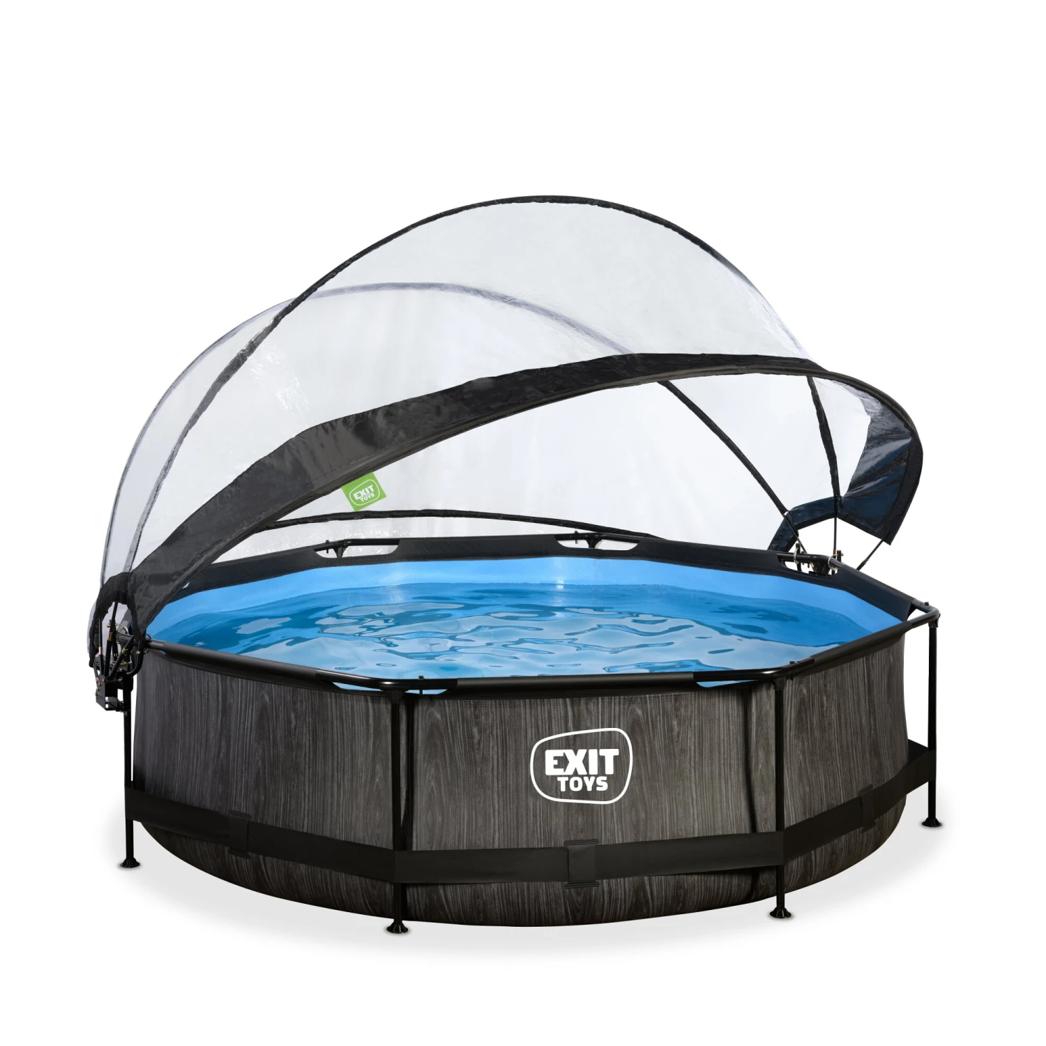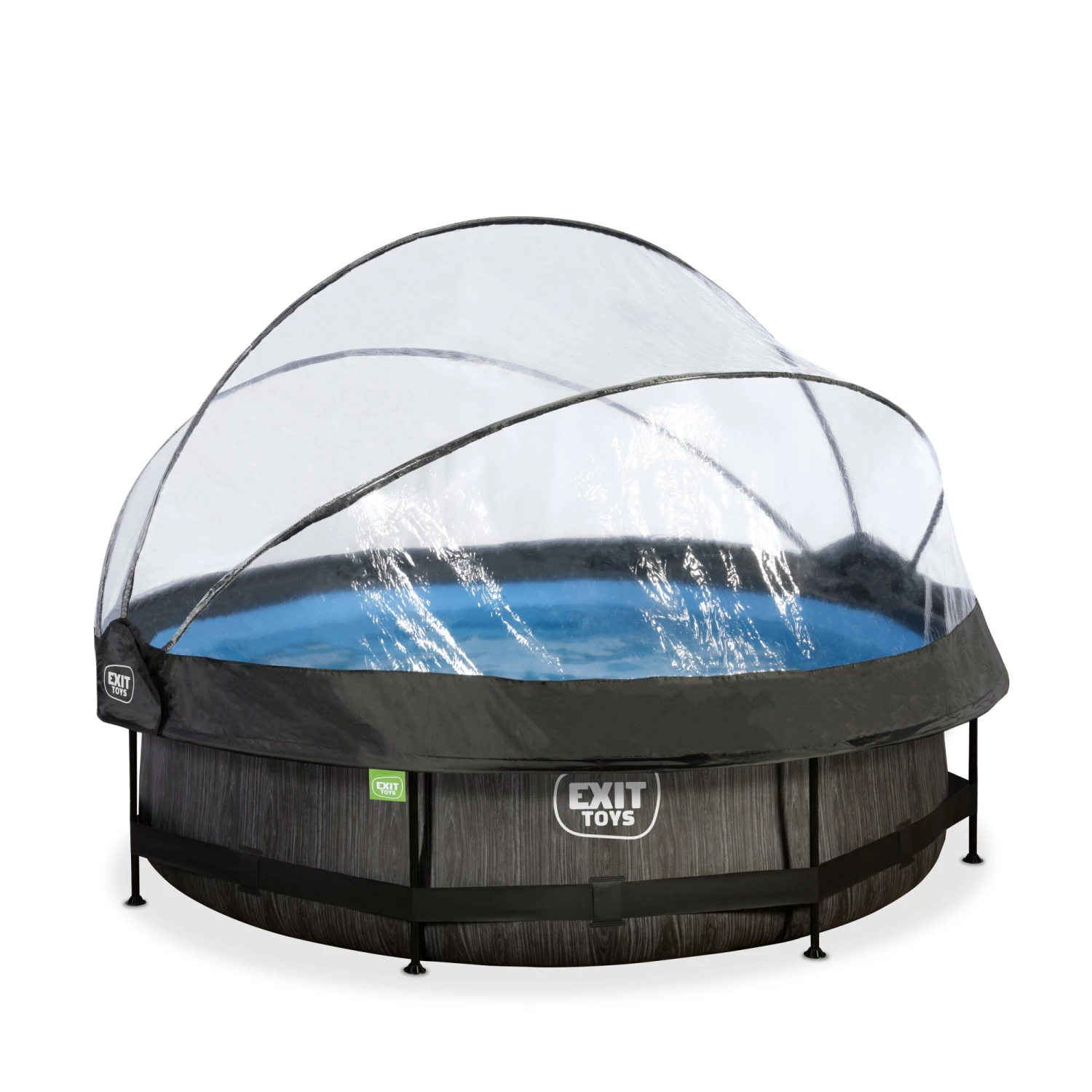 Het EXIT Black Wood zwembad ø300x76cm is een rond frame zwembad met overkapping. Het zwembad is standaard voorzien van een filterpomp en valt op tussen andere zwembaden door zijn stoere donkere houtpatroon. Ben je op zoek naar een leuk en tegelijkertijd uniek en hoogwaardig frame zwembad in je tuin? Steel de show met de ronde zwembaden van EXIT Toys!