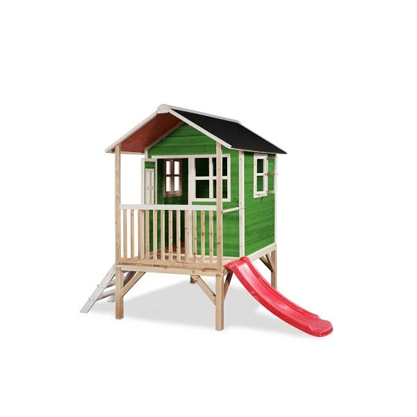 De speelhuisjes van EXIT Toys zijn gemaakt van FSC® gecertificeerd cederhout (FSC 100%, FSC® SCS-COC-007799). Deze houtsoort splintert niet en is van nature bestand tegen weersinvloeden zoals regen en dus resistent tegen houtrot. Het EXIT Loft 300 speelhuis heeft daarnaast een waterdicht bitumen dak, waardoor kinderen er in weer en wind mee kunnen spelen. Je hoeft EXIT houten speelhuisjes voor gebruik niet te behandelen, kinderen kunnen er direct veilig mee spelen.