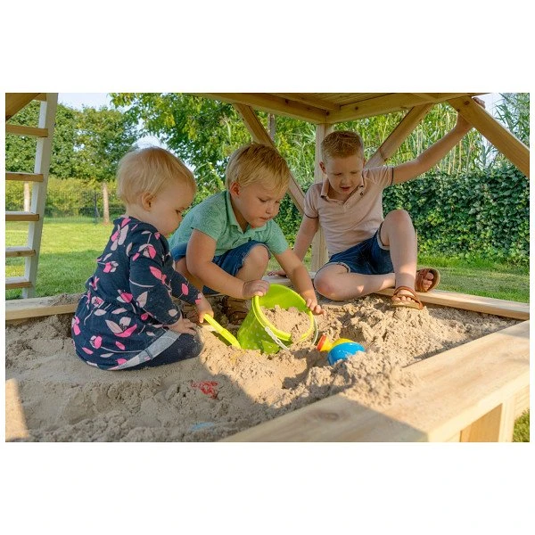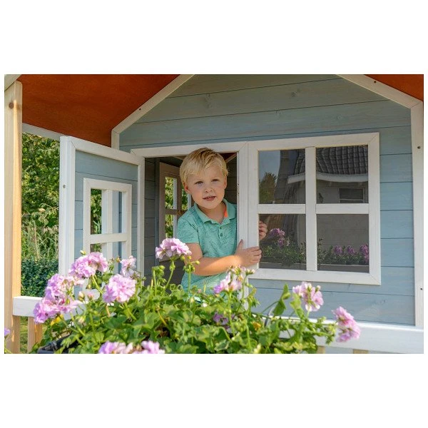 De speelhuisjes van EXIT Toys zijn gemaakt van FSC® gecertificeerd cederhout (FSC 100%, FSC® SCS-COC-007799). Deze houtsoort splintert niet en is van nature bestand tegen weersinvloeden zoals regen en dus resistent tegen houtrot. Het EXIT Loft 500 speelhuis heeft daarnaast een waterdicht bitumen dak, waardoor kinderen er in weer en wind mee kunnen spelen. Je hoeft EXIT houten speelhuisjes voor gebruik niet te behandelen, kinderen kunnen er direct veilig mee spelen.