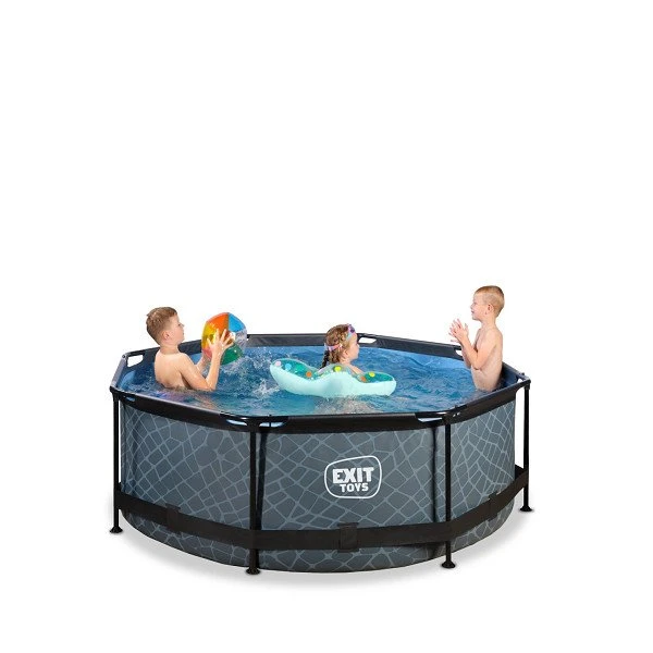 Het stoere steenpatroon en zwarte frame geven het Stone zwembad een unieke uitstraling en dankzij de natuurlijke look integreert het zwembad volledig in je tuin. De binnenzijde van het zwembad is blauw, zodat je het frisse zwembad gevoel houdt.
