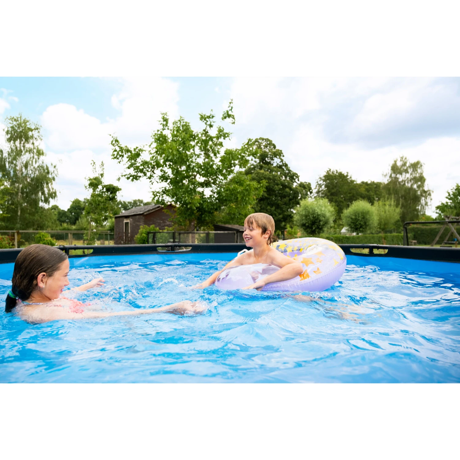 Het Stone zwembad heeft een modern en stoer steenpatroon op de zijkant en is daarmee een échte blikvanger in de tuin. De binnenzijde van het zwembad is blauw, voor het frisse zwembadgevoel. Het EXIT zwembad is uitgevoerd met sterke 3-laags wanden, van PVC en polyester. De ronde vorm van het zwembad creëert een gezellige sfeer en zorgt ervoor dat je eenvoudig met meerdere personen plezier kunt beleven in het zwembad. Ontdek wie het snelst een baantje kan trekken, dobber samen rond op een luchtbed of duik speeltjes van de bodem op. Kortom: met de ronde zwembaden van EXIT Toys verveel je je geen moment.