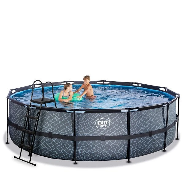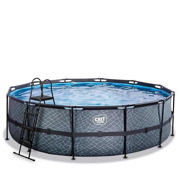 Ontdek hoe stevig een rond opzetzwembad kan zijn: het gepoedercoate stalen frame en de sterke poten van het EXIT Stone zwembad zorgen ervoor dat het bad altijd stabiel staat en jarenlang meegaat. De meegeleverde filterpomp houdt het water schoon en in beweging zodat vervuiling van het water wordt tegengegaan.