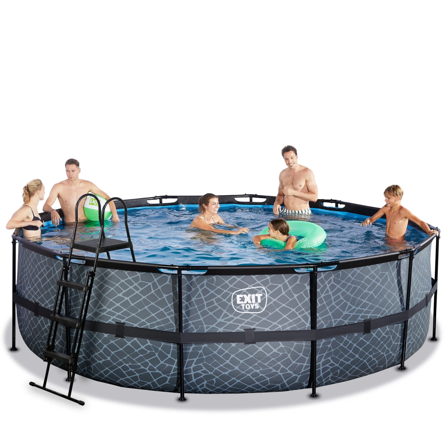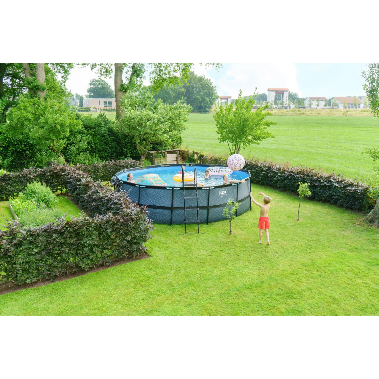 Het EXIT Stone zwembad ø488 x 122 cm is een rond, grijskleurig frame zwembad. Het zwembad is standaard voorzien van een zandfilterpomp en een zwembadtrap, waarmee je veilig het zwembad in en uit kunt stappen. Door de zeer royale diameter en een diepte van maar liefst 122 centimeter beleef je in het zwembad van EXIT Toys een zomerlang zwemplezier met familie en vrienden.