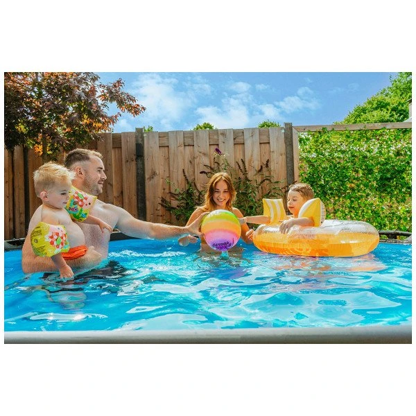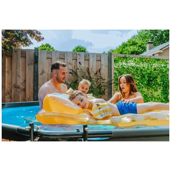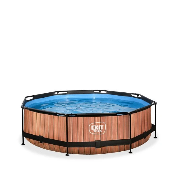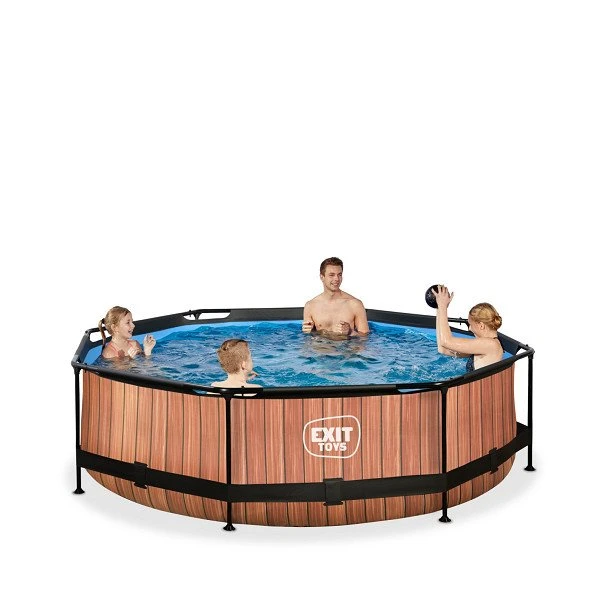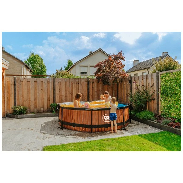 Het stoere houtpatroon en zwarte frame geven het Wood zwembad een unieke uitstraling en dankzij de natuurlijke look integreert het zwembad volledig in je tuin. De ronde vorm van het zwembad creëert een gezellige sfeer en zorgt ervoor dat je eenvoudig met meerdere personen plezier kunt beleven in je zwembad. Met de ronde zwembaden van EXIT Toys verveel je je geen moment.
