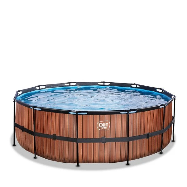 Ontdek hoe stevig een rond opzetzwembad kan zijn: het gepoedercoate stalen frame en de sterke poten van het EXIT Wood zwembad zorgen ervoor dat het bad altijd stabiel staat en jarenlang meegaat. En het meegeleverde watercirculatiesysteem maakt dit zwembad helemaal af. De hoogwaardige zandfilterpomp reinigt de kleinste deeltjes uit het zwembad door het water krachtig door het filterbed heen te pompen.