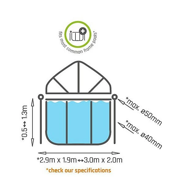 De overkapping is snel aan het frame van het zwembad te bevestigen en eenvoudig te openen en sluiten door het unieke scharniermechanisme. De kap kan zelfs half open blijven staan, zodat je eenvoudig in en uit het bad kunt stappen.